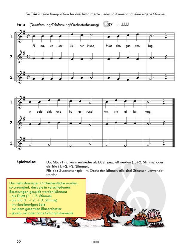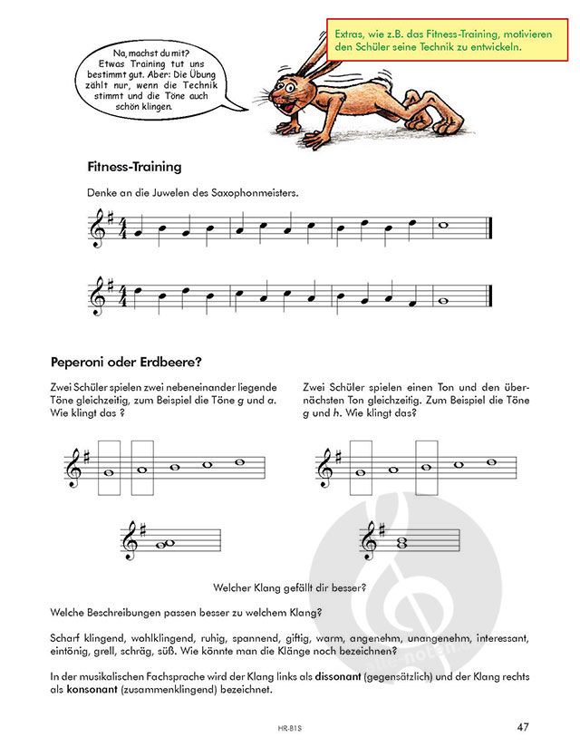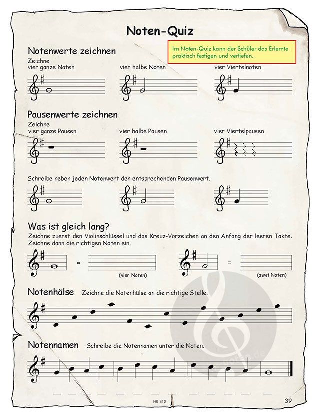 Die Motivation der Schüler wird durch spielerische Elemente gefördert. Der Einführung in die Notenlehre folgt am Ende jedes Kapitels das Noten-Quiz, um das Erlernte praktisch zu festigen und zu vertiefen. Musikalische Gruppenspiele machen den Kindern Spaß und entwickeln das Gehör und das Rhythmusgefühl.