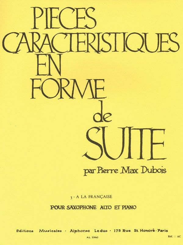 French composer, Pierre Max Dubois (1930-1995) significantly contributed to the woodwind repertoire, particularly for Saxophone. Characteristic Pieces in the Form of a Suite for Alto Saxophone and Piano was published in 1962 andremains popular in the advanced saxophonist's repertoire. Dubois' music is characteristically light-hearted with unusual harmonic and melodic textures. The second movement of Characteristic Pieces in the Form of a Suite for AltoSaxophone and Piano, To the French Woman reflects Dubois' compositional characteristics as well as elements of French characteristics, with a typical performance lasting about four minutes and 45 seconds. Characteristic Pieces inthe Form of a Suite is essential to the advanced saxophonist's repertoire. Dubois' most famous work makes for an exciting and enjoyable performance for players and audiences alike.