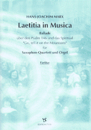 Ballade über Psalm 146 und das Spiritual 'Go, tell it on the Mountains' für Saxophon-Quartett und Orgel - Laetitia in Musica - Freude in der Musik - Freude an der Musik - Freude durch die Musik - Trost durch die Musik. So kann man den lateinischen Titel der Komposition deuten und übersetzen. Dem vorliegenden Werk dient als inhaltliche Vorgabe der Psalm 146, in dem es heisst: 'Halleluja, lobe den Herrn, meine Seele! Ich will den Herrn loben, solange ich lebe, und meinem Gott lobsingen, solange ich bin!'