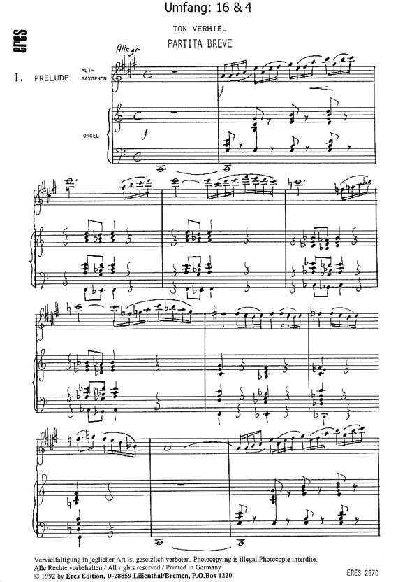 Für Alt-Saxophon und Orgel. Inhalt: 1. Prelude 2. Menuett 3. Gigue. Mit Erfolg aufgeführt während des Welt-Saxopgon-Kongress in Pesaro (Italien). Auff.-Dauer: 10'10 min.