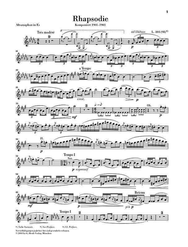 Unser Klavierauszug stützt sich auf die gleichzeitig erscheinende Studien-Edition HN9989, die erstmals Debussys Particell im gedruckten Notenbild zugänglich macht. Der Komponist überließ dem Saxophon nur wenige Soloeinsätze. Es ist heute übliche Praxis, vor allem in der Fassung mit Klavierbegleitung, dem Saxophon weitere aus dem Orchester entnommene Melodieabschnitte anzuvertrauen. Deshalb bietet unsere Ausgabe neben der Originalstimme eine erweiterte Solostimme, die von Daniel Gauthier, Professor für klassisches Saxophon an der Kölner Musikhochschule, eingerichtet wurde. Dies ist das erste Werk für Saxophon im Henle-Katalog.