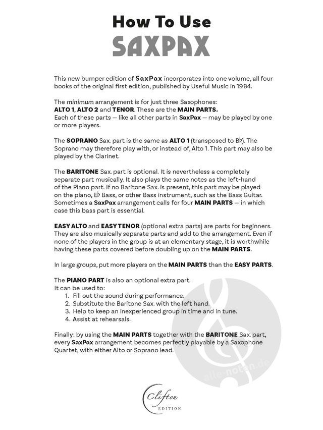 Unverzichtbar für Saxophongruppen in Schulen, da jede Kombination - von drei Saxophonen (2 Altos und ein Tenor) bis hin zu einem kompletten Saxophonchor - sie verwenden kann.