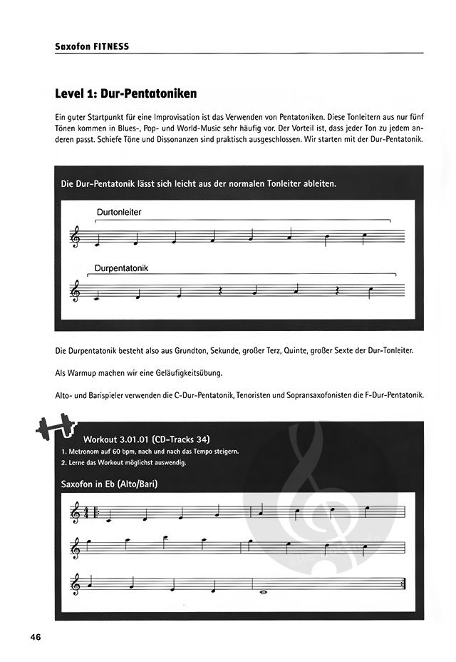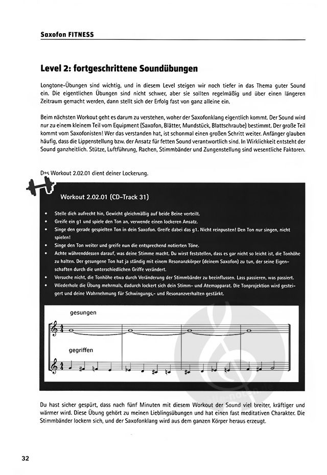 Dein individueller Trainingsplan Wer weiterkommen will, muss täglich üben. Aber was soll ich wann üben und in welcher Reihenfolge? Auf diese Fragen gibt das individuelle Trainingsprogramm Saxofon Fitness jetzt die richtigen Antworten: In nur 10 Minuten täglich kannst du dein Saxofonspiel wesentlich verbessern. Mit Saxofon Fitness legst du selbst fest, was du übst. Du verbesserst deine Technik, indem du gezielt Hände und Finger trainierst. Du entwickelst deinen persönlichen Sound durch Tonübungen und arbeitest im Bereich Improvisation an deinen Solofähigkeiten. Auch Intonation und Gehör werden nicht vernachlässigt. Auf zwei CDs findest du Playbacks und Demos zu den Übungen. Da bleiben keine Fragen offen. Mit Saxofon Fitness trainiert der fortgeschrittene Anfänger ebenso wie der Profi unabhängig von Stilrichtungen. Das Übungskonzept sorgt dafür, dass Ziele schnell erreicht werden, ohne dass die Übungsmotivation verloren geht. Das modulare Trainingssystem eignet sich auch ideal zur Einbindung in den Saxofonunterricht.