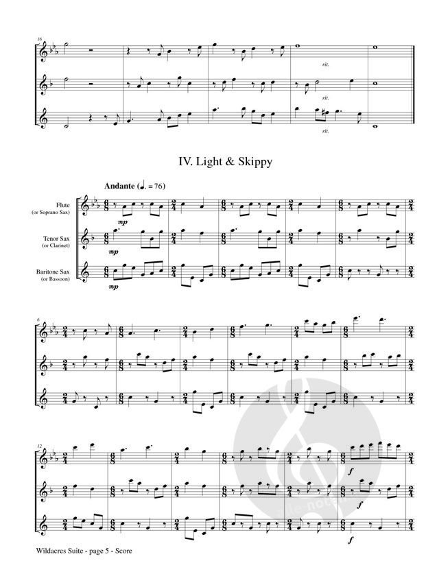 Composed as a collaboration between the Wildacres Flute Retreat and the James Houlik Saxophone Retreat, A delightful work in five movements. Instrumentation: Part 1: Soprano Sax, Flute; Part 2: Tenor Sax, Clarinet; Part 3: Baritone Sax, Bassoon