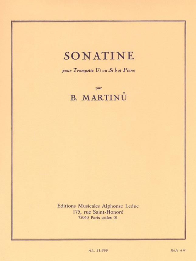 Bohuslav Martinu (1890-1959) was a prolific Czech composer, writing many large scale works. The composer moved to Paris in 1923 where he began experimenting in a variety of composition styles. Sonatine for Trumpet and Piano was composed in 1957 and is adaptable to both the B flat and C Trumpet. Martinu himself was a violinist but he liked to experiment and the mid-1950s saw him move to Nice in France, where he began writing Sonatas for wind and brass. Sonatine for Trumpet exemplifies the composer's influence of Stravinsky, Debussy and jazz music. The piece is excitingly virtuosic in its use of flutter tonguing, complex rhythms, chromaticism, and ensemble between the Trumpet and Piano. As a varied, substantial work for the Trumpet repertoire, Martinu 's Sonatine is essential to the advanced trumpeter.