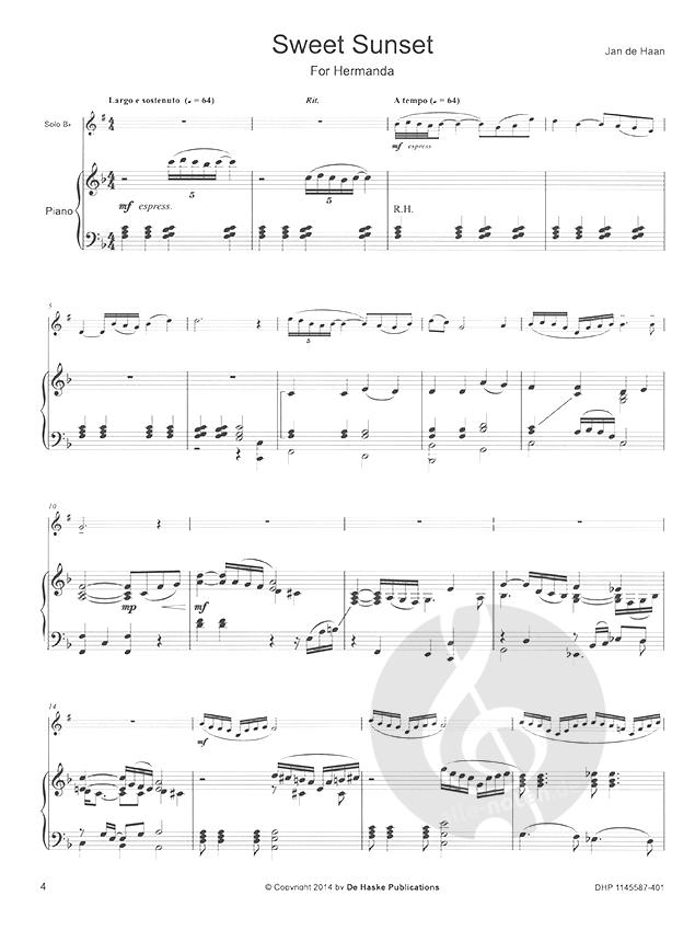 Die Hitze des Tages verebbt, während die Sonne langsam am westlichen Horizont versinkt. Ein schillernder Reigen warmer Farben aus pulsierendem Gelb, glühendem Orange und brennendem Rot erhellt den Abendhimmel, bevor ruhige Blautöne, kühle Lilaschattierungen und schließlich die Schwärze der Nacht Abkühlung bringen. Solche unvergesslichen Sonnenuntergänge inspirieren Jan de Haan zur Komposition dieses Stückes für diverse Blasinstrumente und Klavierbegleitungen.