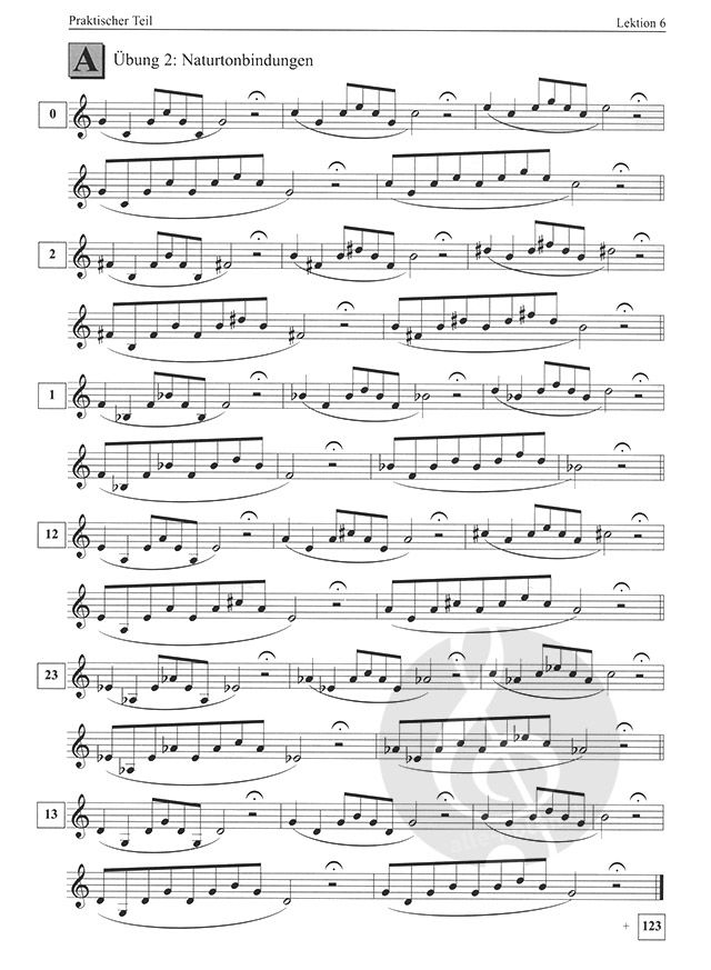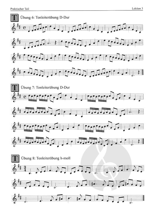 Technik: Tonleiterübungen, Fingertechnik, Intervallübungen und Zungentechnik verfeinern das technische Können und bringen dem Bläser ein hohes Maß an Genauigkeit und Treffsicherheit. Hier werden bestimmte Tonfolgen und Griffkombinationen im Detail eingeübt und gefestigt.