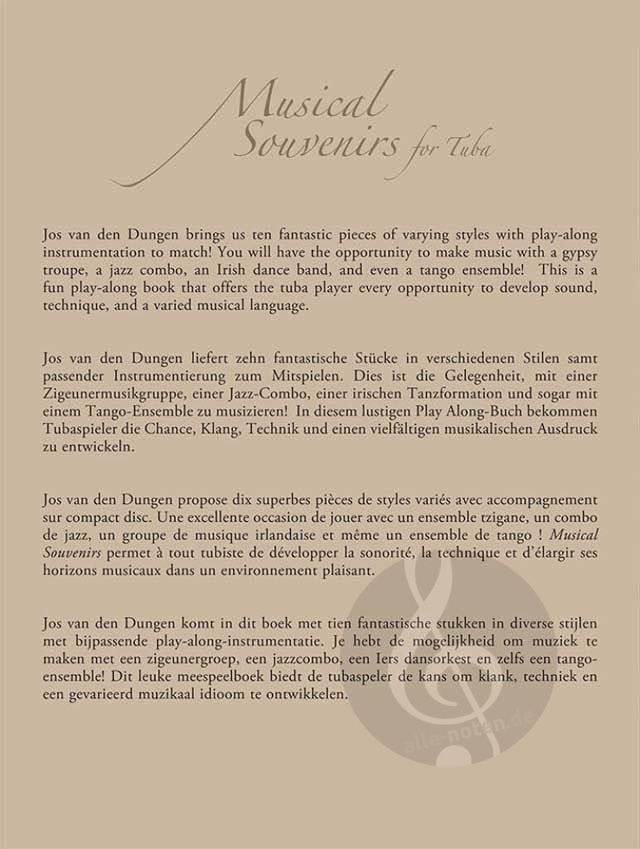 Jos van den Dungen komponierte zehn fantastische Stücke in verschiedenen Stilen samt passender Instrumentierung zum Mitspielen. Dies ist die Gelegenheit, mit einer Jazz-Combo, einer irischen Tanzformation und sogar mit einem Tango-Ensemble zu musizieren! In diesem lustigen Play-Along-Buch bekommen Tubisten die Chance, Klang, Technik und einen vielfältigen musikalischen Ausdruck zu entwickeln. Auf dem live Online-Audio erklingen die Stücke je zwei Mal: zum Hören und zum Mitspielen. Reizvoll und lehrreich!