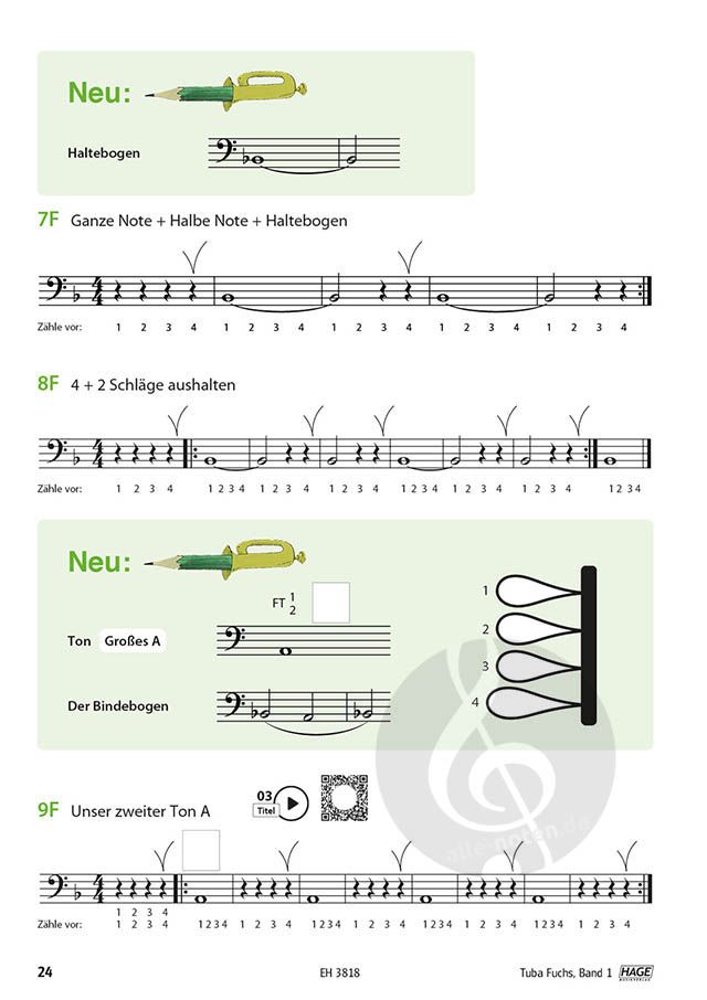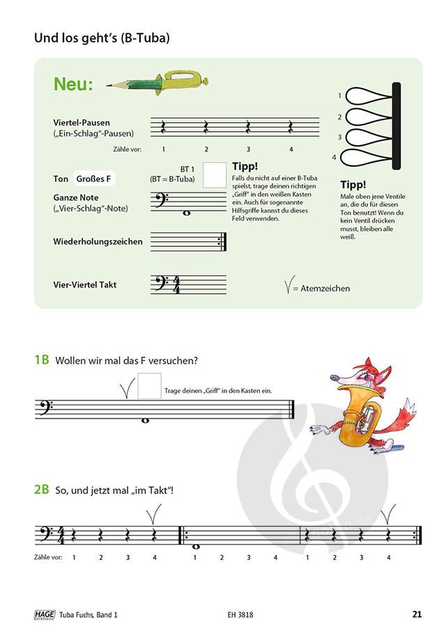 Der Tuba Fuchs ist für den Einzel- und Gruppenunterricht auf F- und B-Tuba konzipiert. Er kann aber auch für Es- und C-Tuba verwendet werden. Das 'ausgefuchste' Lehrkonzept ist auch für Trompete, Flügelhorn, Klarinette, Posaune, B- und F-Horn erhältlich.