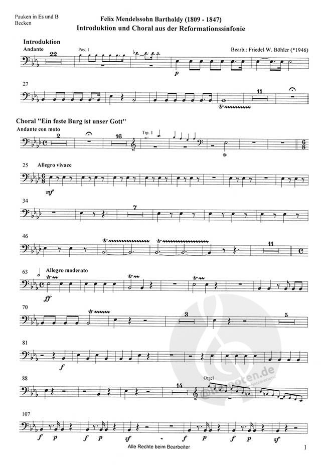 - Opt. Besetzung 3-4 Trompeten, 3-4 Hörner, Tuba, Orgel und Pauke