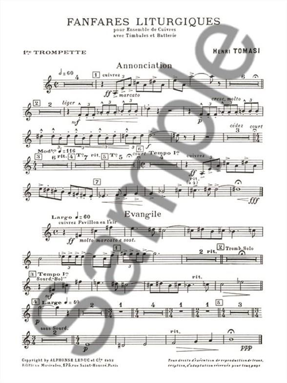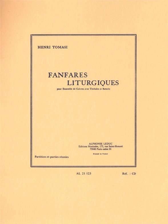 French composer and conductor, Henri Tomasi (1901-1971) published Liturgical Fanfares in 1952. As with his other wind compositions, Liturgical Fanfares was well-received by audiences. Tomasi was born in Marseille, but his Fatherand Mother were originally from La Casinca in Corsica. Despite being pressured into musical studies by his parents, Tomasi dreamed of becoming a sailor, and during the summer he stayed with his Grandmother in Corsica where helearnt traditional Corsican songs. However, in 1921, he began his studies at the Paris Conservatoire and went on to become a high profile composer and conductor. Tomasi did not forget his Corsican routes, often incorporatingthemes of the songs he had learnt during the summers with his Grandmother into his compositions. Composed for an unusual instrumentation of Brass Ensemble, Timpani and Drums, Liturgical Fanfares comprises four movements - 1)Annunciation, 2) Gospel, 3) Apocalypse, and 4) Good Friday Procession. This Tomasi piece is suitable to advanced players and provides an exciting, alternative addition to the ensemble repertoire.