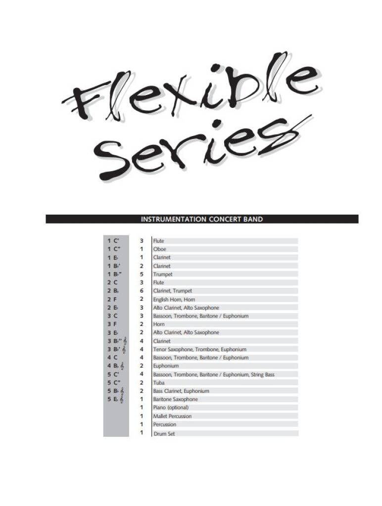 5-part flexible Windband. Each pack contains: Part 1 C: flute, oboe (x4) Bb: Bb clarinet, trumpet, soprano sax, cornet, flugelhorn (x4) Eb: alto sax, Eb clarinet, soprano cornet (x2) Part 2 C: flute,...
