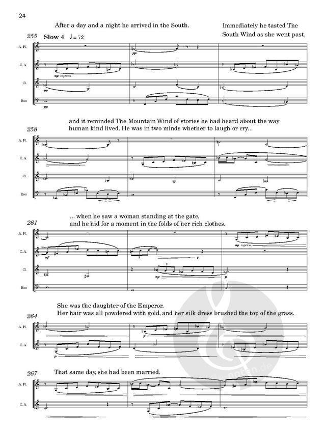 Eine bezaubernde Weihnachtsgeschichte, ideal für ein Familienkonzert. Der Erzähler erzählt die Geschichte und stellt dabei jedes der Instrumente des Bläserquintetts vor. Das Fagott (ein verschlafener Bär), das Englischhorn (eine romantische Dame), die Klarinette (ein verrückter Schuster) und die Piccoloflöte (ein Fischerjunge) werden in Stephen Peggs fantasievoller Geschichte, die auf einer alten chinesischen Fabel beruht, nacheinander vom frühreifen "Bergwind" (dem Waldhorn) besucht.