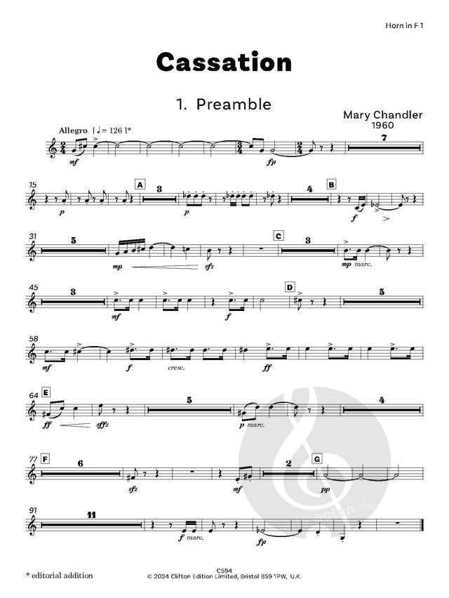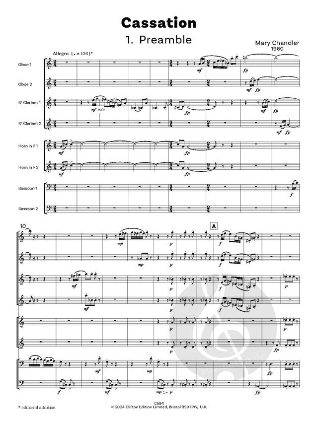 Cassation wurde 1960 für Spieler des Tonbridge Music Centre geschrieben. Cassation ist ein Begriff aus dem 18. Jahrhundert, der sich auf eine mehrsätzige Suite wie eine Serenade oder ein Divertimento bezieht, die sich für Aufführungen im Freien eignet. Mary Chandlers Cassation ist für Bläseroktett (je 2 Oboen, Klarinetten, Hörner und Fagotte) geschrieben und hat fünf kurze Sätze. Es ist konventionell in der Form, wenn auch nicht ganz in der Textur, und es hat einen Hauch von Pastiche, besonders in der Valse und der Gigue.