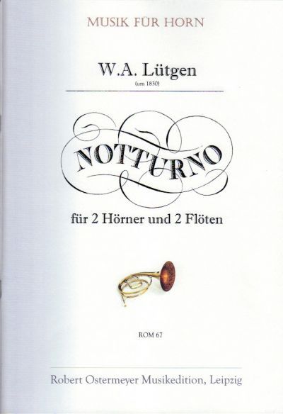 Notturno – Nachtstück, so nennt der Komponist W. A. Lütgen seine Sammlung von 4 Sätzen für die ungewöhnliche Besetzung von 2 Flöten und 2 Hörnern. Doch trifft diese Beschreibung sehr gut den Einsatz dieses Werkes als abendliches Serenadenstück. Das vorliegende Notturno ist 1818 beim Verlag Schott verlegt worden. Instrumentiert ist es noch für Naturhörner und wahrscheinlich einfache Traversflöten.