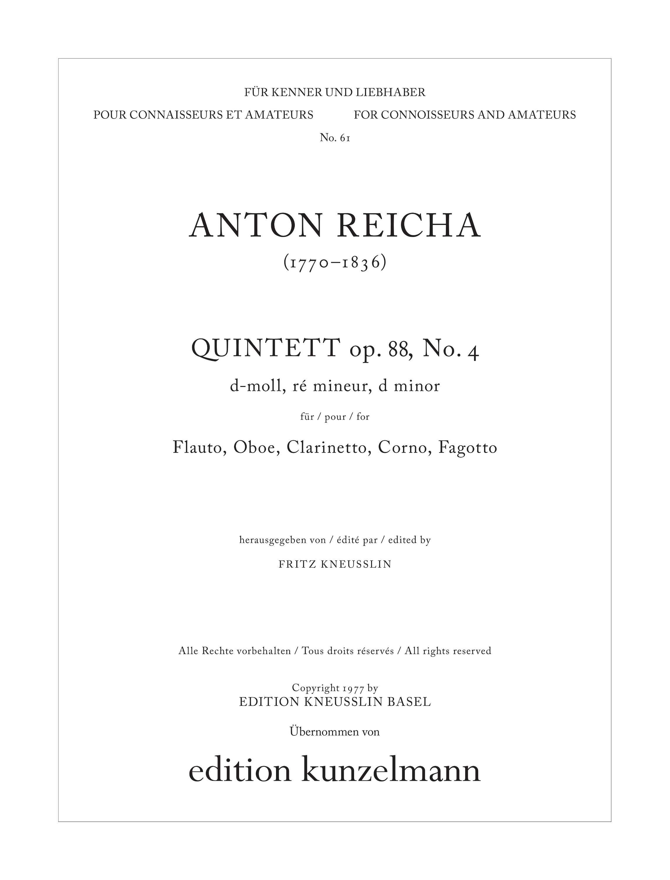 Anton REICHA (1770-1836), ein böhmischer Komponist und Musiktheoretiker, der während des grössten Teils seines Lebens im Ausland tätig war, darf mit Recht als einer der Schöpfer des Bläserquintetts angesehen werden. Seine opera 88, 91, 99 und 100 zu je 6 Nummern sind dieser Gattung gewidmet. Reicha war in Bonn mit dem gleichaltrigen Beethoven von 1784 bis l792 in Freundschaft verbunden, wo beide Mitglieder des kurfürstlichen Orchesters waren. Von 1802 bis 1808 erneuerten in Wien Beethoven und Reicha ihre Beziehungen. Im Jahre 1808 nahm Reicha endgültigen Wohnsitz in Paris, wo er von 1818 bis zu seinem Tode als Kompositionslehrer und Inspektor am Konservatorium tätig war. Berlioz, Gounod, Liszt und C. Franck gehörten zu seinen Schülern. Reichas Bläserquintette waren schon seinerzeit sehr beliebt, gab es doch zu des Komponisten Lebzeiten vier Ausgaben: Jeannet et Cotelle, Boieldieu, Schott und Simrock. Unserer Ausgabe haben wir den Druck von Schott (Platten-Nr. 1091) zugrunde gelegt. Es mussten die üblichen Editionsarbeiten vorgenommen werden wie Korrektur der Druckfehler, Bereinigung der Phrasierungen und der Dynamik. Der originale Klarinettenpart in C wurde nach B transponiert. Für das Andante ist sowohl der originale Text in A wie auch die transponierte Version in B in der Klarinettenstimme enthalten. Als Anregung für die Temponahme sei auf die in der Boieldieu-Ausgabe veröffentlichten Metronom-Angaben hingewiesen. Fritz Kneusslin