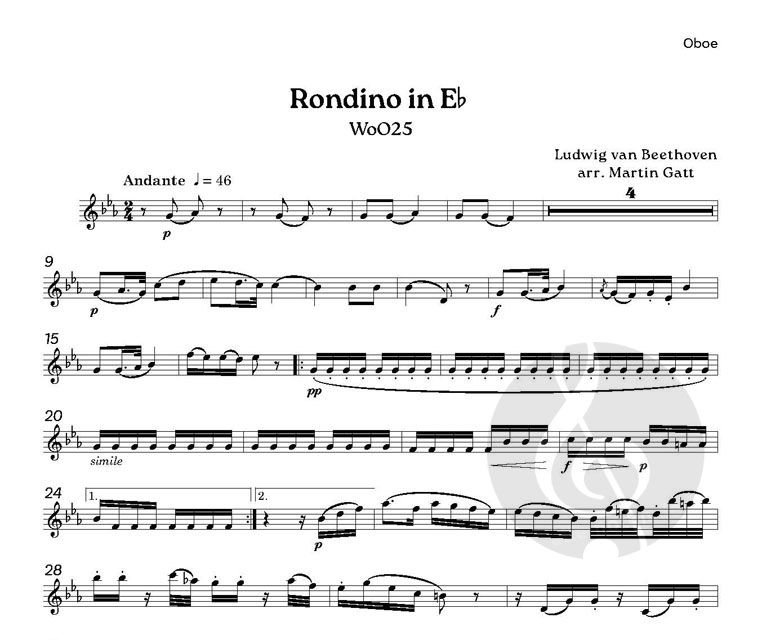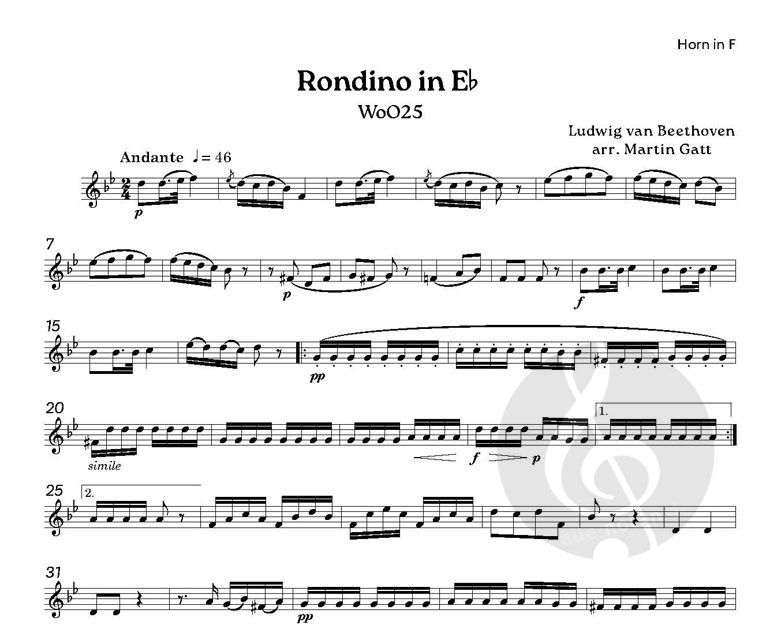 Rondino in Es (WoO25) wurde ursprünglich von Beethoven für Bläseroktett im Jahr 1793 geschrieben. Diese Bearbeitung für Bläserquintett (Flöte, Oboe, Klarinette in B, Horn in F und Fagott) von Martin Gatt wurde erstmals 2017 bei Phylloscopus Publications veröffentlicht. Dauer: ca. 5-6 Minuten.