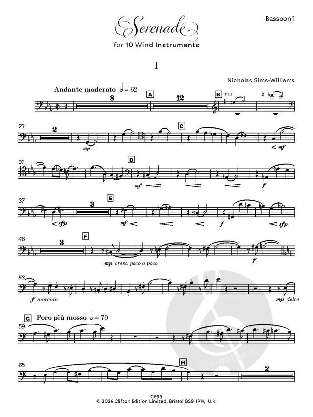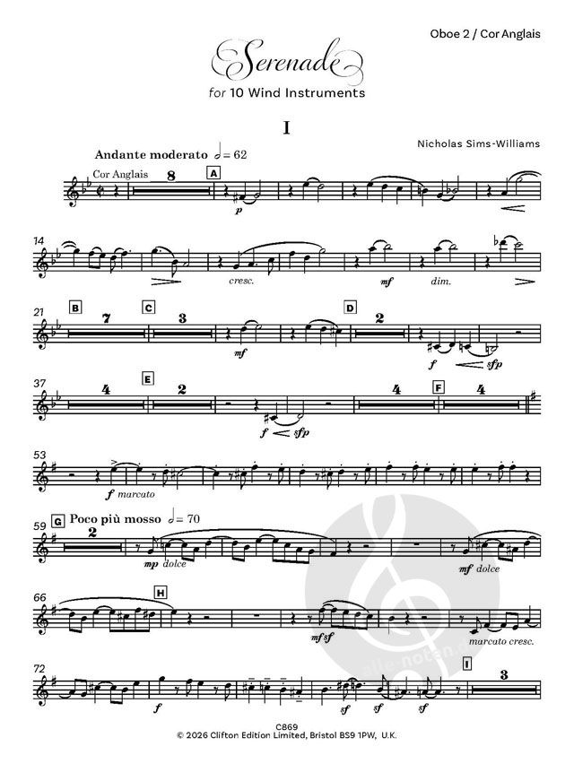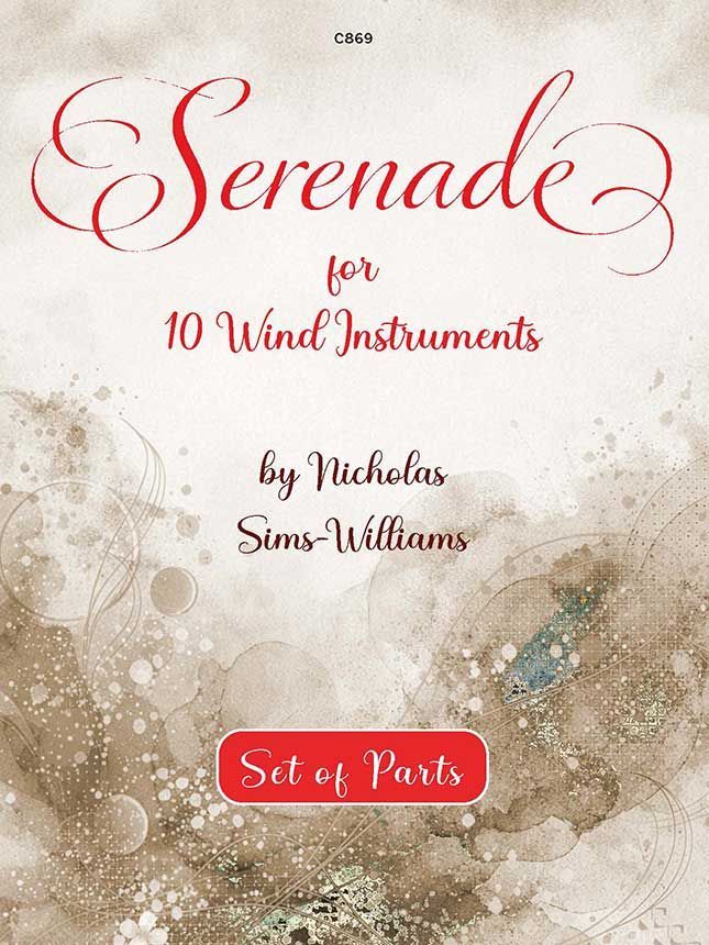 Viele von Nicholas Sims-Williams' Kompositionen sind für Blasinstrumente. Er ist selbst Hornist und mit einer Oboistin verheiratet. Diese Serenade ist ein umfangreiches, etwa 18 Minuten langes Stück für 2 Flöten, 2 Oboen, 2 Klarinetten, 2 Hörner und 2 Fagotte, wobei die zweite Flöte als Piccoloflöte, die zweite Oboe als Englischhorn (nur im ersten Satz) und die zweite Klarinette als Bassklarinette (im letzten Satz) eingesetzt wird. Wenn keine Bassklarinette zur Verfügung steht, sollte die zweite Klarinette die Alternativstimme für Klarinette in A spielen (siehe separate Stimme). Die anderen Instrumente sollten die in ihren Stimmen abgedruckten Bassklarinetten-Stichwörter spielen.