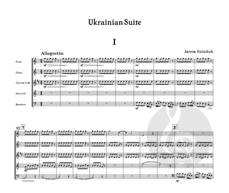 Die ukrainische Suite für Bläserquintett stammt aus dem Jahr 1983 und besteht aus drei Sätzen. Im eröffnenden Allegretto gibt es einen Hinweis auf minimalistische Techniken, wobei die ungewöhnlichen harmonischen Verschiebungen die Spieler herausfordern, konventionelle Kadenzen zu vergessen. Mehrere Teile teilen sich an vielen Stellen parallele Rhythmen, während ein Teil das melodische Material trägt. Ähnliche Prinzipien sind im zweiten Satz Moderato con moto zu beobachten, in dem anhaltende Tonwiederholungen die Melodie begleiten. Der dritte Satz, der ebenfalls mit einem Moderato beginnt, steigert sich zu einem Schlussteil, in dem alle fünf Teile sehr ähnliche Notenmuster aufweisen, und die Spannung wird durch die kontrastierende Dynamik und den unerbittlichen Schwung der Rhythmen erzeugt. Dieses Quintett wurde ursprünglich von Phylloscopus Publications im Jahr 2001 veröffentlicht und nach dem Manuskript von C.M.M. Nex und F.H. Nex gesetzt.