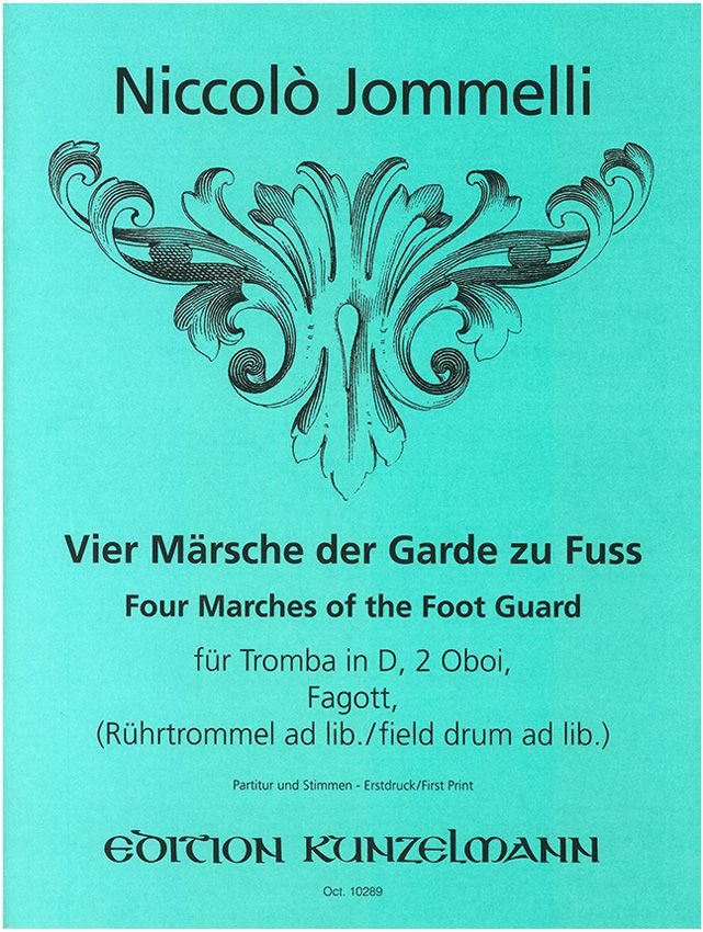 Niccol? Jommelli (1714-1774) war einer der nahmhaftesten neapolitanischen Opernmeister. Sein Werk umfasst hauptsächlich mehr als 80 Opern und Ballette und vielerlei Kirchenmusik. Von 1747-1749 war er Konservatoriumsdirektor in Venedig, wurde dann 2. Kapellmeister an St. Peter in Rom, ging 1753 als Hofkapellmeister nach Stuttgart und kehrte 1769 wieder in seine Heimatstadt Neapel zurück. Ein Großteil seiner Kompositionen ging beim Stuttgarter Theaterbrand im Jahre 1802 verloren. Erhalten blieben vorliegende Märsche, die er für vier Regimenter der Garde zu Fuss der kleinen Armee des Großherzogs von Schwerin komponiert hat. Sie sind sämtliche für 1 Trompete, 2 Oboen und 1 Fagott geschrieben. Eine den Marsch-Rhythmus betonende Rührtrommel ist von Jommelli nicht ausdrücklich notiert; ihre Besetzung galt seinerzeit jedoch als selbstverständlich. Die Märsche tragen die Überschriften: Nr. 1 (D-Dur) Marche de la Garde a pied. Nr. 2 (D-Dur) Marche de Gen: Rhoder, nunmehro Wolff. Nr. 3 (D-Dur) Marche de General Werneck. Nr. 4 (C-Dur) Marche de Spitznahs, nunmehro Wilhelm. Die urschriftlichen Partituren verwahrt (unter der Signatur Mus. 3009) die Wissenschaftliche Allgemeinbibliothek des Bezirkes Schwerin. Ihr ist für die Bereitwilligkeit, mit der sie für diesen Erstdruck Fotokopien herstellte, sehr zu danken. Kurt Janetzky