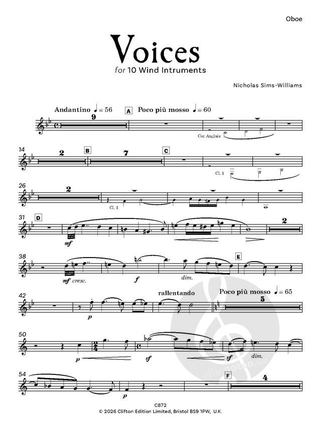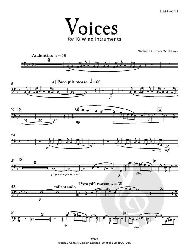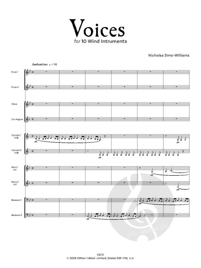 Viele der Kompositionen von Nicholas Sims-Williams sind für Blasinstrumente. Er selbst ist Hornist. Dieses kurze und eingängige einsätzige Werk ist für folgende Instrumente geschrieben: Flöte 1, Flöte 2, Oboe, Englischhorn, Klarinette in Bb 1, Klarinette in Bb 2, Horn in F 1, Horn in F 2, Fagott 1, Fagott 2.