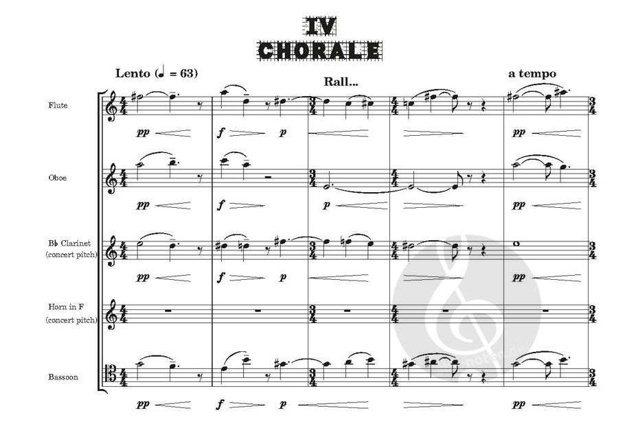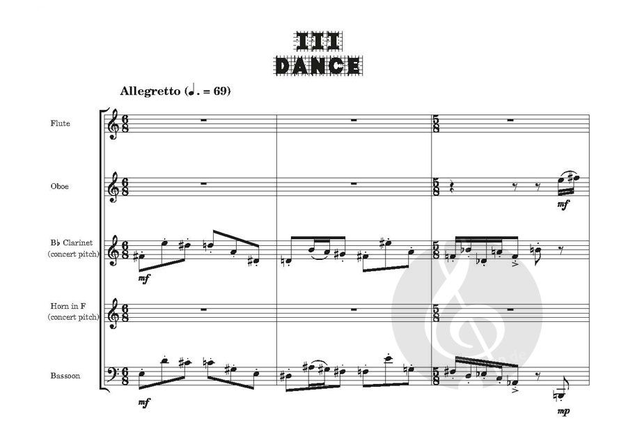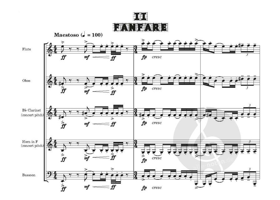 Sechs heitere Sätze: Thema, Fanfare, Tanz, Choral, Tarantella und Fuge.