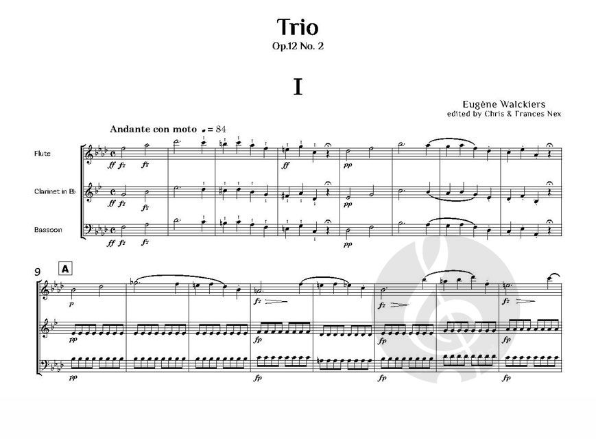 Eugène Walckiers Opus 12 besteht aus drei gut geschriebenen Trios (in h-Moll, f-Moll und c-Moll) für Flöte, Klarinette und Fagott. Die vorliegende Ausgabe präsentiert das dreisätzige Trio Nr. 2 in f-Moll: Andante con moto, das zu Allegro molto führt, Andante und das Finale - Allegro vivo.