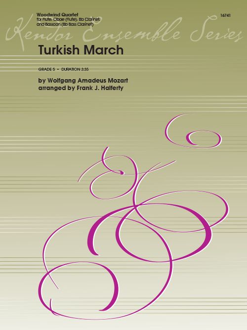 Mozart's classic Turkish March is now available in two, grade 5 editions by Frank J. Halferty. These energetic quartets contain delightful contrast and will make valuable additions to the literature. Perfect for recital or contest programming. Duration 3:35.