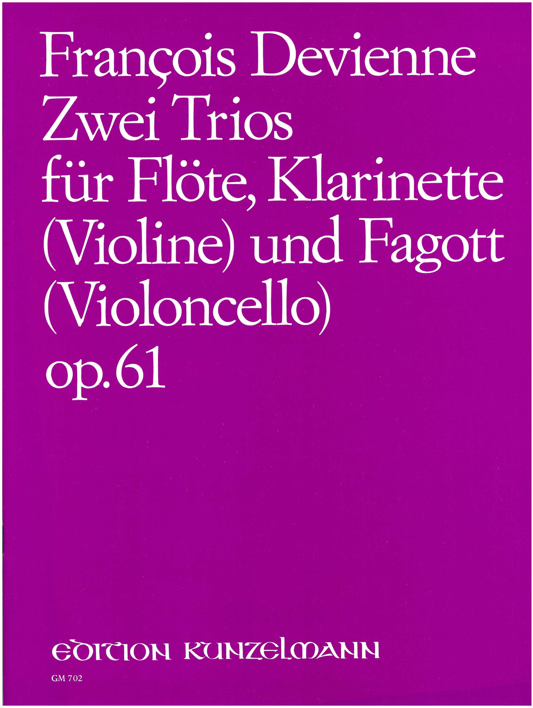 Francois Devienne, 1759 in Joinville (Dpt. Haute-Marne) geboren und 1803 im Irrenhaus zu Charenton verstorben, genoss zu seiner Zeit hohes Ansehen als Flöten- und Fagottvirtuose, als ausserordentlich fruchtbarer Komponist und als der erste Professor für Flöte am 1795 gegründeten Conservatoire de Musique in Paris. André in Offenbach veröffentlichte 1796 als Deviennes op. 61, 1ere Lib. seine äTrois / Trios concertans (sie!) / pour / Fl-te Clarinette et Basson / ou / Fl-te Violon et Violoncelle . . .', von denen er im Jahre 1808 eine äseconde editition (sic!)' nachdrucken konnte. (Das offenbar einzige in Deutschland zu findende Exemplar dieser Ausgabe befindet sich im Besitz des Herausgebers; nach diesem Druck erfolgte die vorliegende neue Edition.) Ergänzungen des Herausgebers wurden mit Strichelung bzw. runder Einklammerung kenntlich gemacht, Anmerkungen als Fussnoten gedruckt. Eckige Klammern bezeichnen Angaben (meist die Dynamik betreffend), die im Original an falscher Stelle stehen oder sich als überflüssig erwiesen. Analoge Stellen wurden fast durchweg angeglichen, in einigen Fällen jedoch auch in ihrer Unterschiedlichkeit belassen (z. B.: Trio II, 1. Satz, Flötenstimme, Takte 89/90 und 93/94; im gleichen Satz die eigenartige dynamische Bezeichnung der Takte 116ff.; die unterschiedliche Phrasierung in Flöte und Fagott der Takte 127 bis 130). Im Rondo des Trios 1 wurde das Da Capo ausgeschrieben. - Die äossia'-Stellen in der Klarinettenstimme betreffen Änderungen der Stimmführung, wenn das Werk mit Violine gespielt wird. Die Bezeichnung ädolce' meint stets äpiano'. Triller, vor allem, wo sie eine Phrase abschliessen, sind durchweg mit Nachschlag auszuführen. Die Angabe zweier verschiedener Instrumentalbesetzungen auf dem Titelblatt des originalen Drucks resultiert wohl einerseits noch aus der im Barock geübten Praxis der Austauschbarkeit mancher Instrumente, hat jedoch andererseits auch seinen Grund im Wunsch von Autor und Verleger, dem Werk damit eine weitere Verbreitung zu ermöglichen. In diesem Sinne sei auch die Neuausgabe vielen Musikfreunden warm empfohlen. Georg Meerwein
