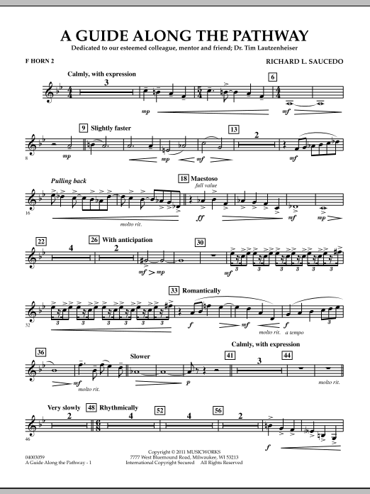 This intense and emotional work was commissioned by the Indiana Music Educators Association and was premiered at the 2011 IMEA Convention with the composer conducting. Written as a gift to longtime friend of music education, Dr. Tim Lautzenheiser, the piece is basically lyrical in nature with beautiful lines and colors. A brief faster section, in the words of the composer, describes that uncomfortable time when we are desperately trying to find ourselves. The piece ends on a solemn yet reaffirming note, reminding us of the importance of guides and mentors along life's pathway. Dur: 5:00