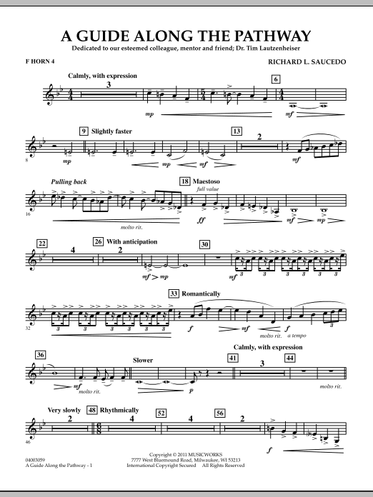 This intense and emotional work was commissioned by the Indiana Music Educators Association and was premiered at the 2011 IMEA Convention with the composer conducting. Written as a gift to longtime friend of music education, Dr. Tim Lautzenheiser, the piece is basically lyrical in nature with beautiful lines and colors. A brief faster section, in the words of the composer, describes that uncomfortable time when we are desperately trying to find ourselves. The piece ends on a solemn yet reaffirming note, reminding us of the importance of guides and mentors along life's pathway. Dur: 5:00
