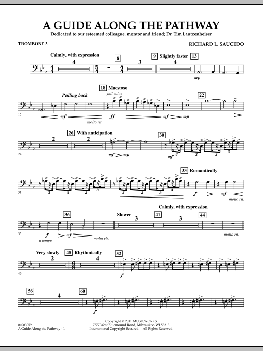 This intense and emotional work was commissioned by the Indiana Music Educators Association and was premiered at the 2011 IMEA Convention with the composer conducting. Written as a gift to longtime friend of music education, Dr. Tim Lautzenheiser, the piece is basically lyrical in nature with beautiful lines and colors. A brief faster section, in the words of the composer, describes that uncomfortable time when we are desperately trying to find ourselves. The piece ends on a solemn yet reaffirming note, reminding us of the importance of guides and mentors along life's pathway. Dur: 5:00