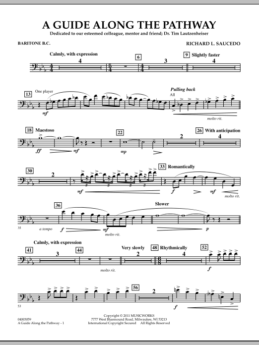 This intense and emotional work was commissioned by the Indiana Music Educators Association and was premiered at the 2011 IMEA Convention with the composer conducting. Written as a gift to longtime friend of music education, Dr. Tim Lautzenheiser, the piece is basically lyrical in nature with beautiful lines and colors. A brief faster section, in the words of the composer, describes that uncomfortable time when we are desperately trying to find ourselves. The piece ends on a solemn yet reaffirming note, reminding us of the importance of guides and mentors along life's pathway. Dur: 5:00