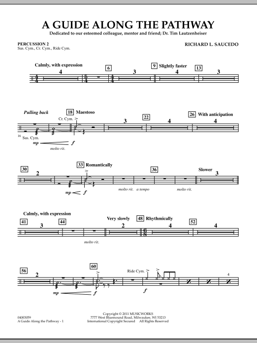 This intense and emotional work was commissioned by the Indiana Music Educators Association and was premiered at the 2011 IMEA Convention with the composer conducting. Written as a gift to longtime friend of music education, Dr. Tim Lautzenheiser, the piece is basically lyrical in nature with beautiful lines and colors. A brief faster section, in the words of the composer, describes that uncomfortable time when we are desperately trying to find ourselves. The piece ends on a solemn yet reaffirming note, reminding us of the importance of guides and mentors along life's pathway. Dur: 5:00