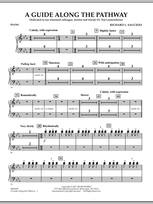 This intense and emotional work was commissioned by the Indiana Music Educators Association and was premiered at the 2011 IMEA Convention with the composer conducting. Written as a gift to longtime friend of music education, Dr. Tim Lautzenheiser, the piece is basically lyrical in nature with beautiful lines and colors. A brief faster section, in the words of the composer, describes that uncomfortable time when we are desperately trying to find ourselves. The piece ends on a solemn yet reaffirming note, reminding us of the importance of guides and mentors along life's pathway. Dur: 5:00