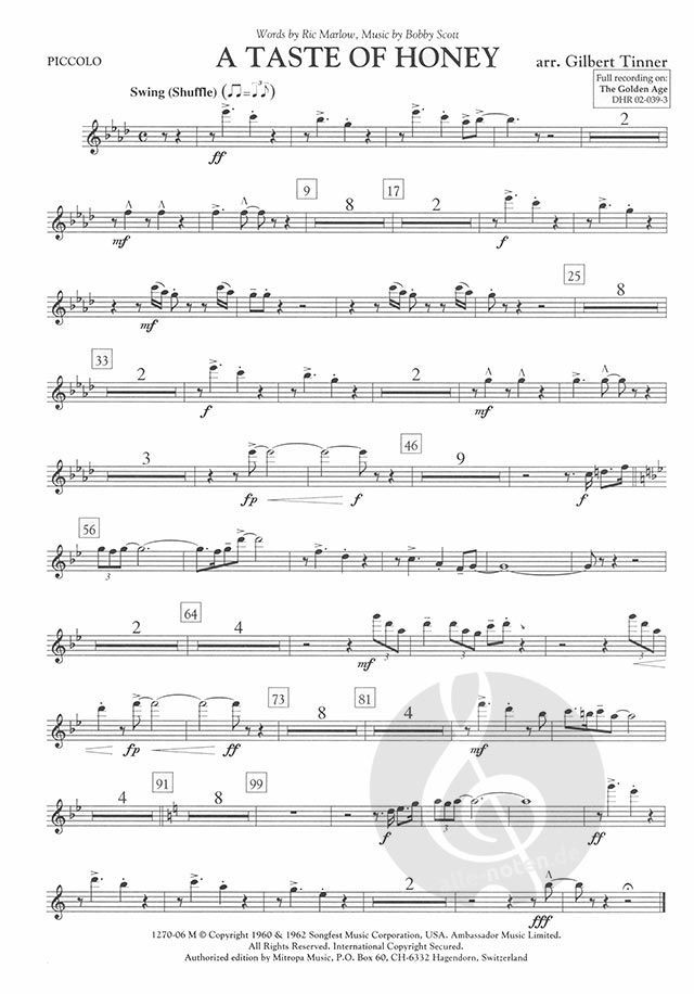 Schon mal von Tijuana Taxi, Spanish Flea oder A Taste of Honey gehört? Bis heute haben diese Melodien, die Herb Alpert und Tijuana Brass in den sechziger Jahren zum Durchbruch verhalfen, nicht an Popularität verloren. A Taste of Honey überrascht in der Blasorchesterbearbeitung von Gilbert Tinner mit spannungsgeladenen Abschnitten, spritzigen und eingängigen Passagen sowie farbigen Instrumentierungen. Zweifellos ein Arrangement, mit dem Sie das Publikum auf Ihrer Seite haben werden!