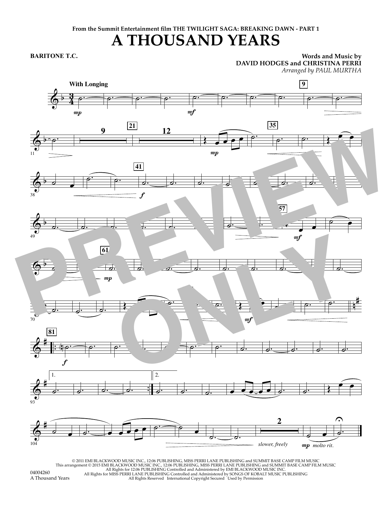 Die bekannte Ballade von Christina Perri aus dem Twilight-Film. Paul Murtha hat den Popsong leicht im 3/4-Takt arrangiert. Ideal für Jugendblasorchester.