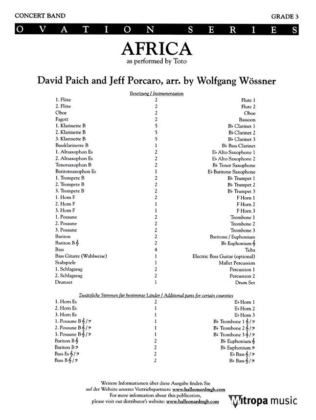 Als die Bandmitglieder der Rockband TOTO Africa schrieben, wollten sie den Song bereits aufgeben und ihn aus dem geplanten Album herausnehmen, da es schon so lange gedauert hatte, die passende Melodie zu finden. Sie konnten damals nicht ahnen, dass dieser Song ein internationaler Megahit werden sollte! Viel Spaß mit diesem tollen Arrangement im Schwierigkeitsgrad 3 von Wolfgang Wössner.