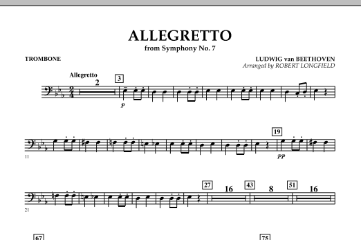 Dieser Satz aus Beethovens Symphonie Nr. 7 ist eines der bekanntesten und meistgespielten Themen des Meisters. Kürzlich war er im Oscar-prämierten Film The King's Speech zu hören. Hier ist eine gekonnte und wirkungsvolle Bearbeitung für junge Bands von Robert Longfield. Eine großartige Möglichkeit, die klassische Periode der Musikgeschichte in jedem Programm zu präsentieren. Dauer: 2:45