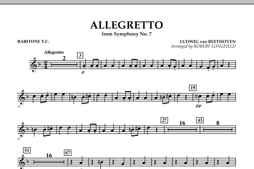 Dieser Satz aus Beethovens Symphonie Nr. 7 ist eines der bekanntesten und meistgespielten Themen des Meisters. Kürzlich war er im Oscar-prämierten Film The King's Speech zu hören. Hier ist eine gekonnte und wirkungsvolle Bearbeitung für junge Bands von Robert Longfield. Eine großartige Möglichkeit, die klassische Periode der Musikgeschichte in jedem Programm zu präsentieren. Dauer: 2:45