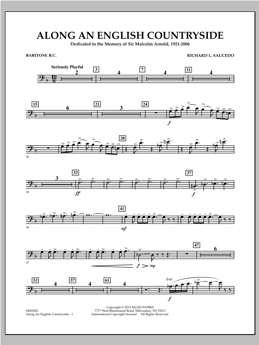 Composed in 12/8 and entirely in one energetic tempo, this masterful work is a musical tribute to the late Sir Malcolm Arnold, one of the most notable English composers of our time. The opening section features a variety of short solo statements of the theme, which then leads to well-timed and impressive declarations from the entire ensemble. Within in the confines of this brief yet impressive work, Richard manages to skillfully capture feelings of both seriousness and playfulness. Along an English Countryside is wonderful as a program opener for festival or contest. Dur: 2:55