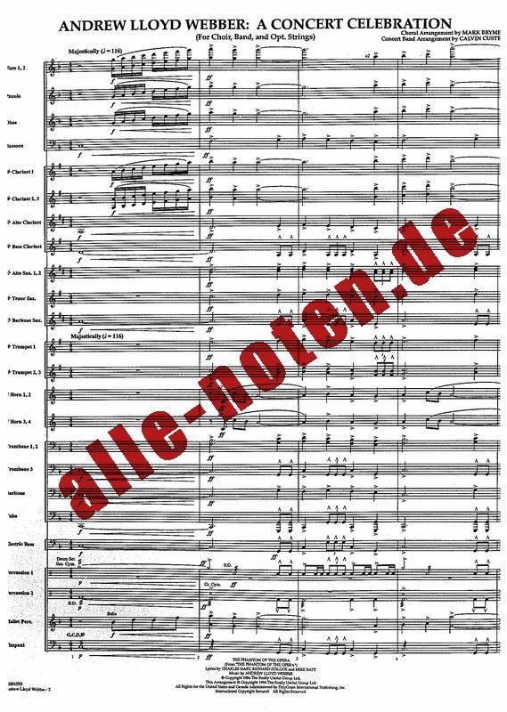 The music of Andrew Lloyd Webber continues to dominate the entertainment scene and is now available in this spectacular medley for band, choir, and strings. What a better way to close a concert with the combined ensembles! Includes: The Phantom Of The Opera, Music Of The Night, Don't Cry For Me Argentina, Superstar, King Herod's Song, Memory, and Go Go Go Joseph.