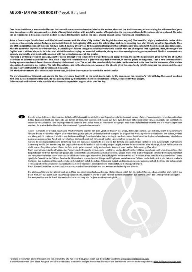 Aulos – Concerto for Double Reeds and Wind Orchestra beginnt mit dem "großen Bruder" der Oboe, dem Englischhorn. Das schöne, leicht melancholische Timbre dieses Instruments eignet sich besonders gut für lyrische und melodische Passagen. Zu Beginn des Werks spielt der Solist hinter der Bühne, sodass der Klang wörtlich wie auch bildlich aus der Ferne erklingt. Damit wird eine der ursprünglichen Funktionen der Oboen-Familie heraufbeschworen, nämlich der pastoralen Atmosphäre Ausdruck zu verleihen, die traditionell mit Hirten und weiten Landschaften verbunden ist.