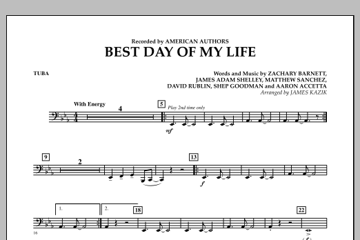 Best Day of my Life' von der Pop-Gruppe American Authors ist nicht nur aus den Charts bekannt, sondern auch durch das Erscheinen in zahlreichen TV-Spots zu einem Erfolg geworden. Hier ist das wundervolle Arrangement von James Kazik für Jugendblasorchester.