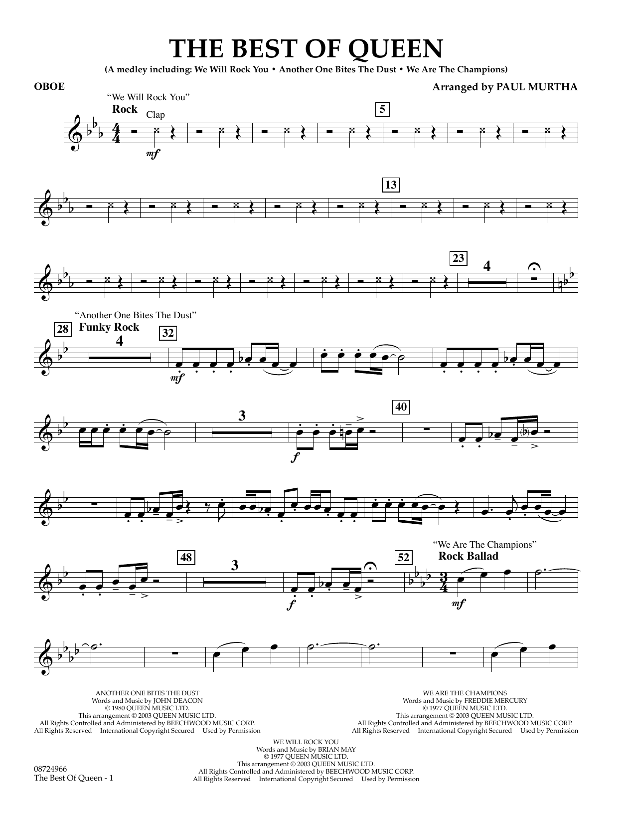 Die Gruppe Queen hat mit ihren treibenden Rhythmen und eingängigen Riffs die "Rockhymne" praktisch erfunden. Hier ist ein leichtes, aber knallhartes Medley aus drei ihrer größten Hits: We Will Rock You, Another One Bites the Dust und We Are the Champions.