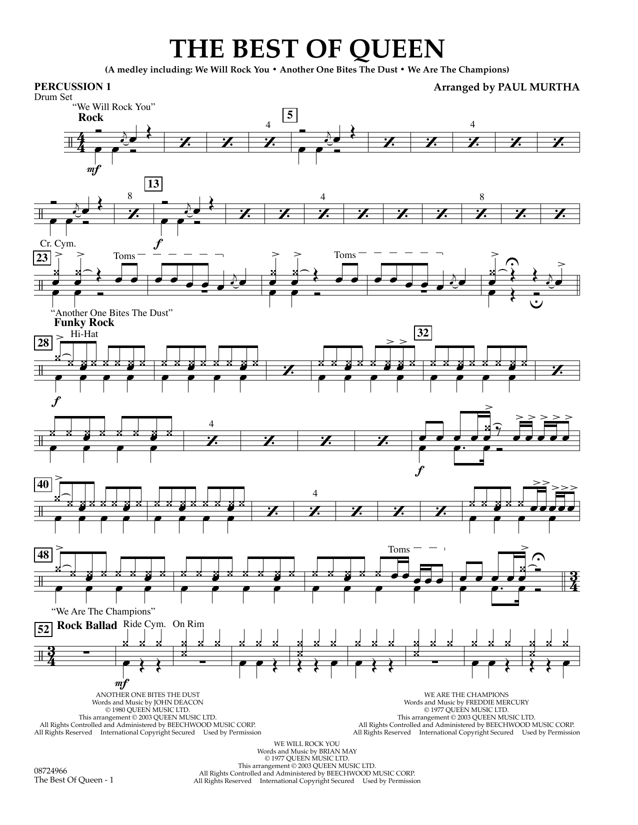 Die Gruppe Queen hat mit ihren treibenden Rhythmen und eingängigen Riffs die "Rockhymne" praktisch erfunden. Hier ist ein leichtes, aber knallhartes Medley aus drei ihrer größten Hits: We Will Rock You, Another One Bites the Dust und We Are the Champions.