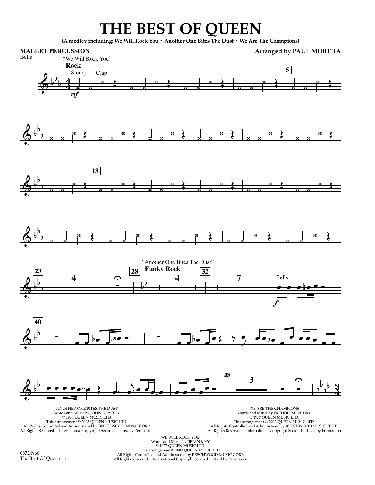 Die Gruppe Queen hat mit ihren treibenden Rhythmen und eingängigen Riffs die "Rockhymne" praktisch erfunden. Hier ist ein leichtes, aber knallhartes Medley aus drei ihrer größten Hits: We Will Rock You, Another One Bites the Dust und We Are the Champions.