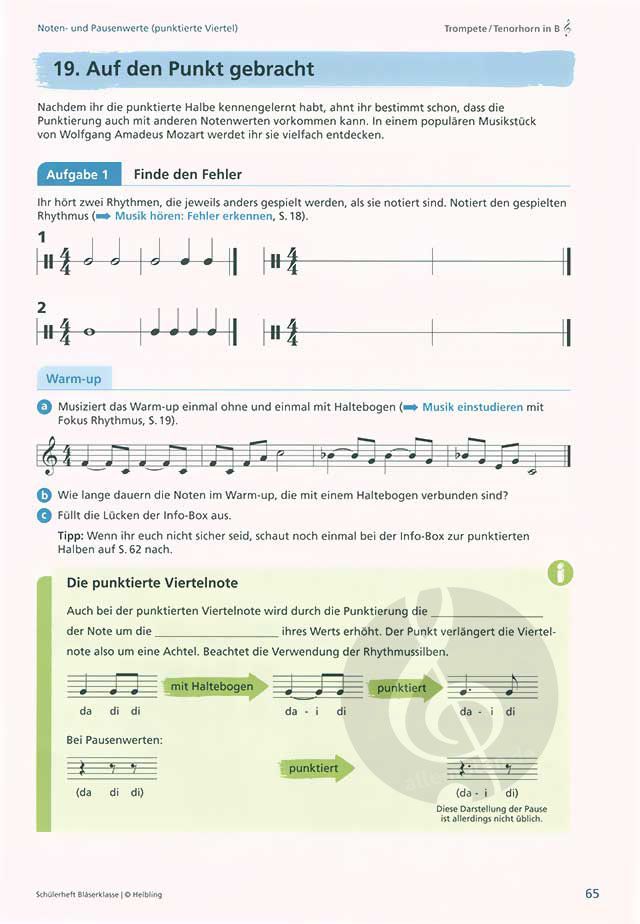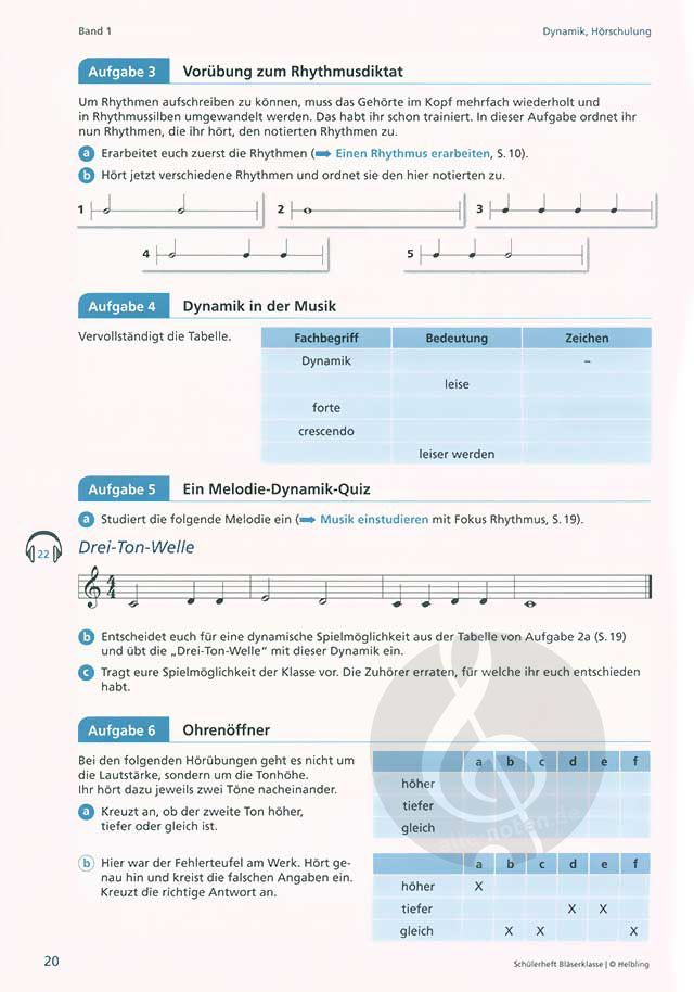 Die Schülerhefte enthalten das didaktisch aufbereitete Material eingeteilt in Lektionen, die durch das gesamte Schuljahr führen. Hier findet sich nicht nur das binnendifferenzierte Notenmaterial für jedes Instrument in Transposition und Lage sondern auch vielfältige und handlungsorientierte Aufgabenstellungen zu Hör- und Rhythmusschulung, Improvisation, Musiklehre u.v.m. Daneben sorgen motivierende, das Thema vertiefende Spielideen für eine Auflockerung des Unterrichts und Spaß am gemeinsamen Musizieren. Die grafisch ansprechend aufbereiteten Seiten machen das Lernen in der Bläserklasse zu einem Vergnügen!