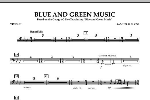 The stunning artwork of Georgia O'Keeffe is no more apparent than in her famous 1921 painting entitled Blue and Green Music. Fittingly commissioned by the Patrick Marsh Middle School in Sun Prairie, Wisconsin (O'Keeffe's birthplace), Samuel Hazo does an amazing job of portraying subtle as well as bold colors into musical terms. Based on a single theme that is manipulated and varied throughout, the piece progresses from delicate mallet percussion effects up to climactic impact points for the entire ensemble. O'Keeffe explained her idea that music could be translated into something for the eye. And Mr. Hazo succeeds wonderfully in translating it back into something for the ear!