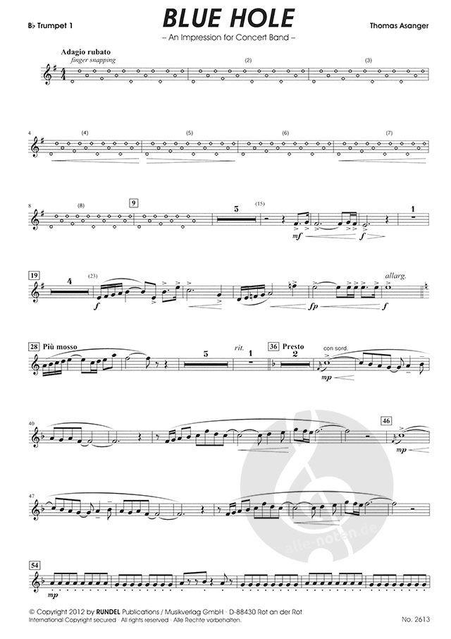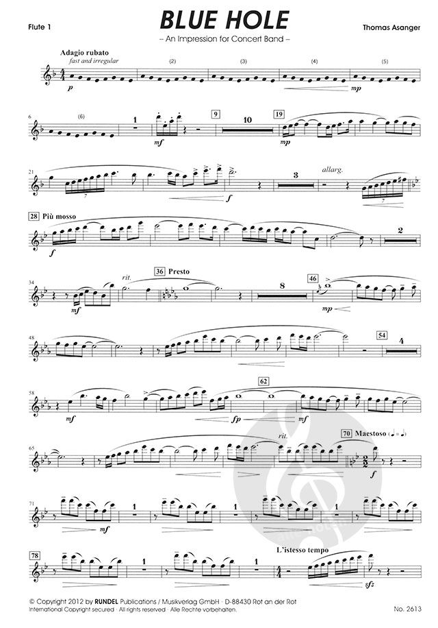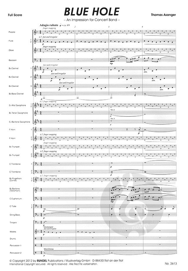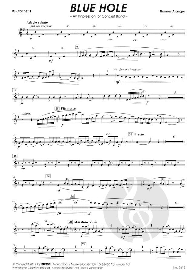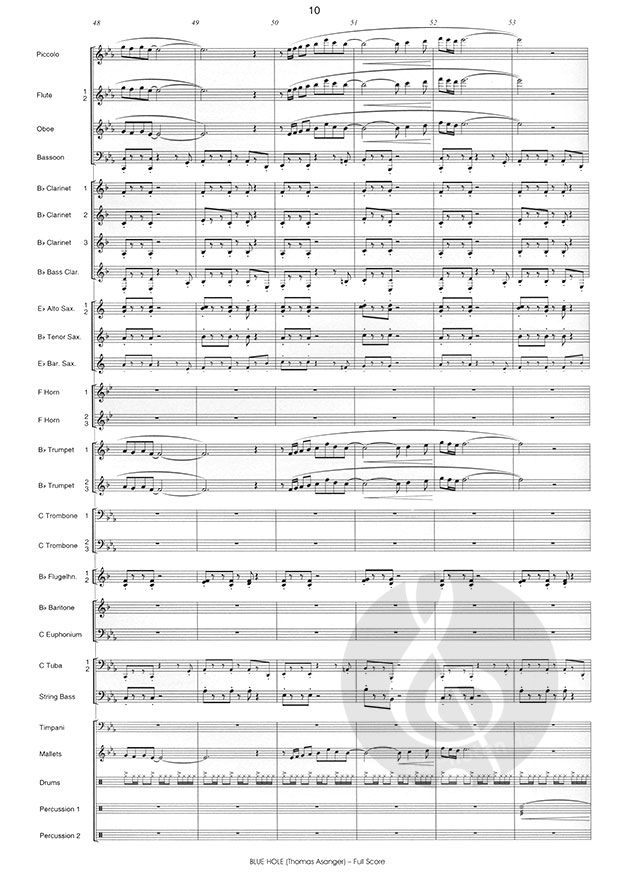 'Blue Hole' beschreibt den Mythos rund um einen der spektakulärsten Tauchgründe der Welt vor der Küste des mittelamerikanischen Staates Belize. Erzählungen von Tauchern zufolge befindet sich in einer Tiefe von etwa 140 Metern eine unterirdische Wunderwelt an Tropfsteinhöhlen, einst durch das Ansteigen des Meeresspiegels geflutet. Dieses komplexe Höhlensystem lässt für Meeresforscher viele Fragen über seine Entstehung offen. Für Taucher ist das große blaue Loch nicht nur aufgrund der Vielfalt an Korallen und Fischarten von großem Reiz - nicht selten endet ein Abgang in das tückische 'Great Blue Hole' für einen Taucher tödlich. Die Komposition 'Blue Hole' vermittelt die verschiedenen Aspekte dieses Naturphänomens und seiner Faszination - die mysteriöse Anziehungskraft, die gespannte Vorfreude auf die Ergründung der Geheimnisse, die lauernde Gefahr des Abenteuers und natürlich die atemberaubende Schönheit dieses außergewöhnlichen Naturschauspiels. All das vertonte Thomas Asanger in diesem mitreißenden Konzertwerk.